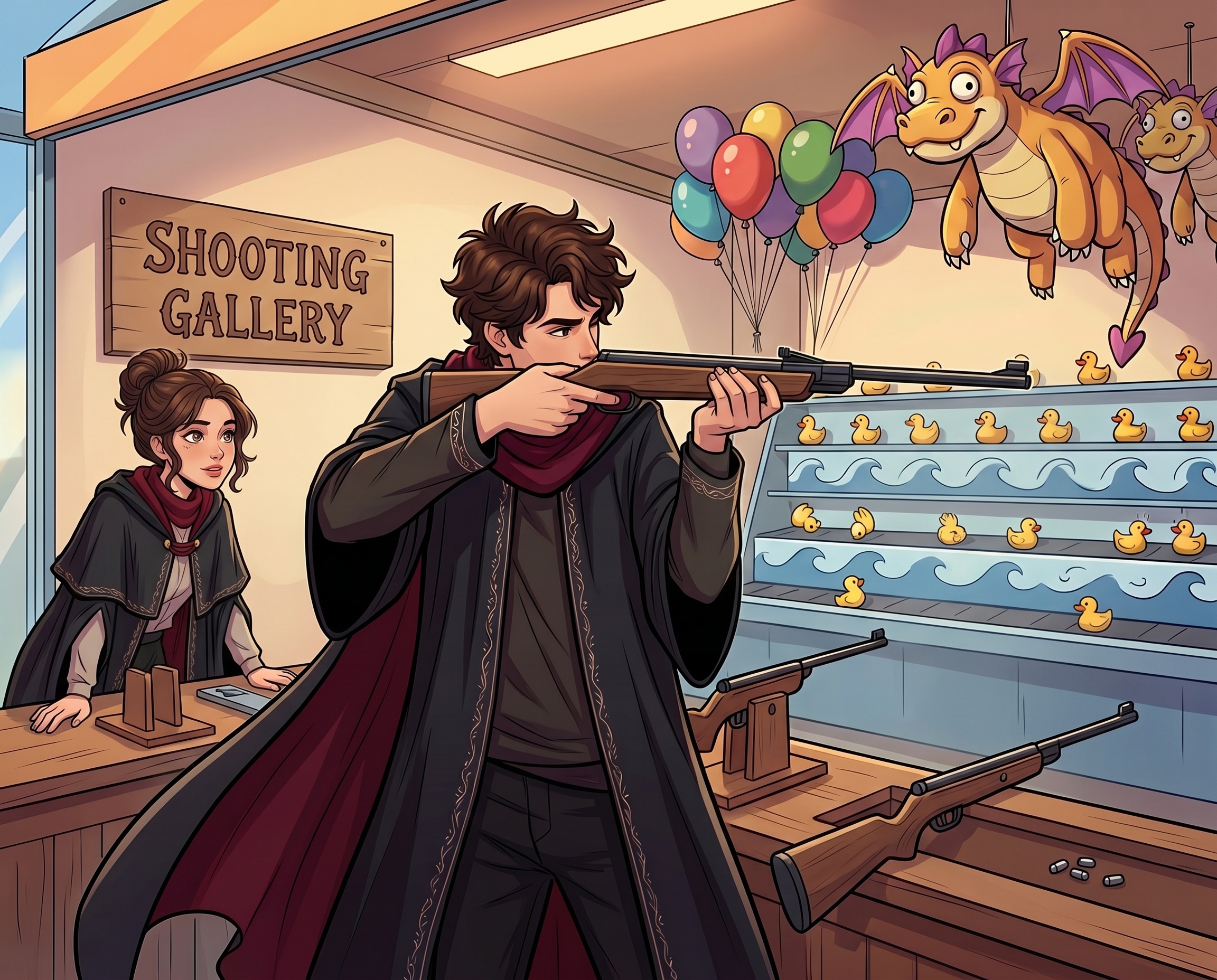 Дейм заправил пульку без моей помощи. Учится на лету. С хрустом закрыл ружье, встал навытяжку, как заправский охотник, не используя деревянную подставку, чтобы прицелиться получше. Он застыл, метясь в уточку. Выстрел. Уточка, проплывающая по нарисованным волнам, перевернулась вверх ногами.