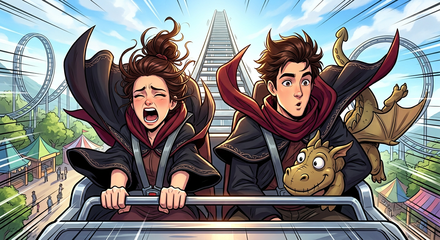 Вагончик тронулся, начался медленный подъем к первой вершине. Дейм подался вперед, я, наоборот, вжалась в спинку кресла, тихонечко попискивая. Вверх, вверх, вверх… Короткая пауза, наполненная тревожным ожиданием… И вагончик рухнул с высоты пятиэтажного дома, со свистом рассекая воздух.